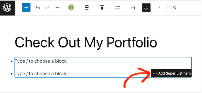 之后,转到您要添加列表的页面或发布内容。然后,您可以单击“+”图标并开始输入“超级列表”。