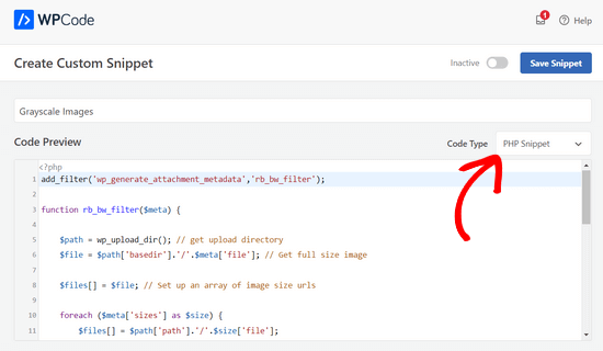 您还需要从右侧的下拉列表中选择“PHP Snippet”作为代码类型。